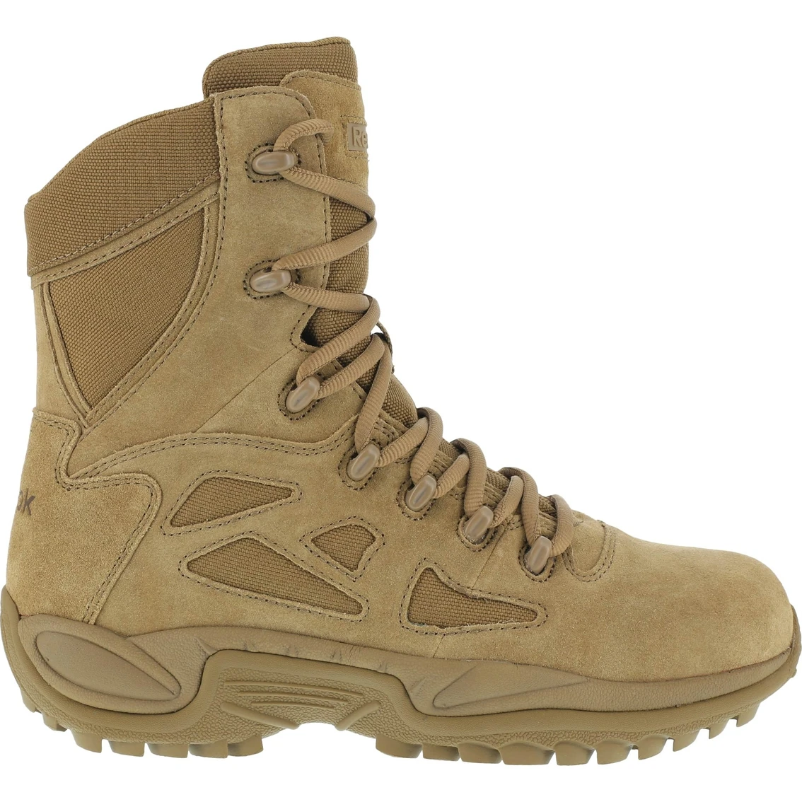 Made with cattle hide leather and ballistic nylon, Reebok Duty RB897 Rapid Response RB Stealth 8 in. Tactical Boots are coyote color and AR670-1 Compliant. They are dual density, with mountain trail rubber bottom and EVA cushion midsole. Model: RB897.