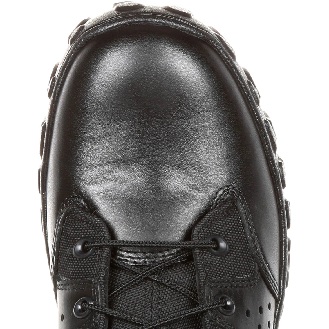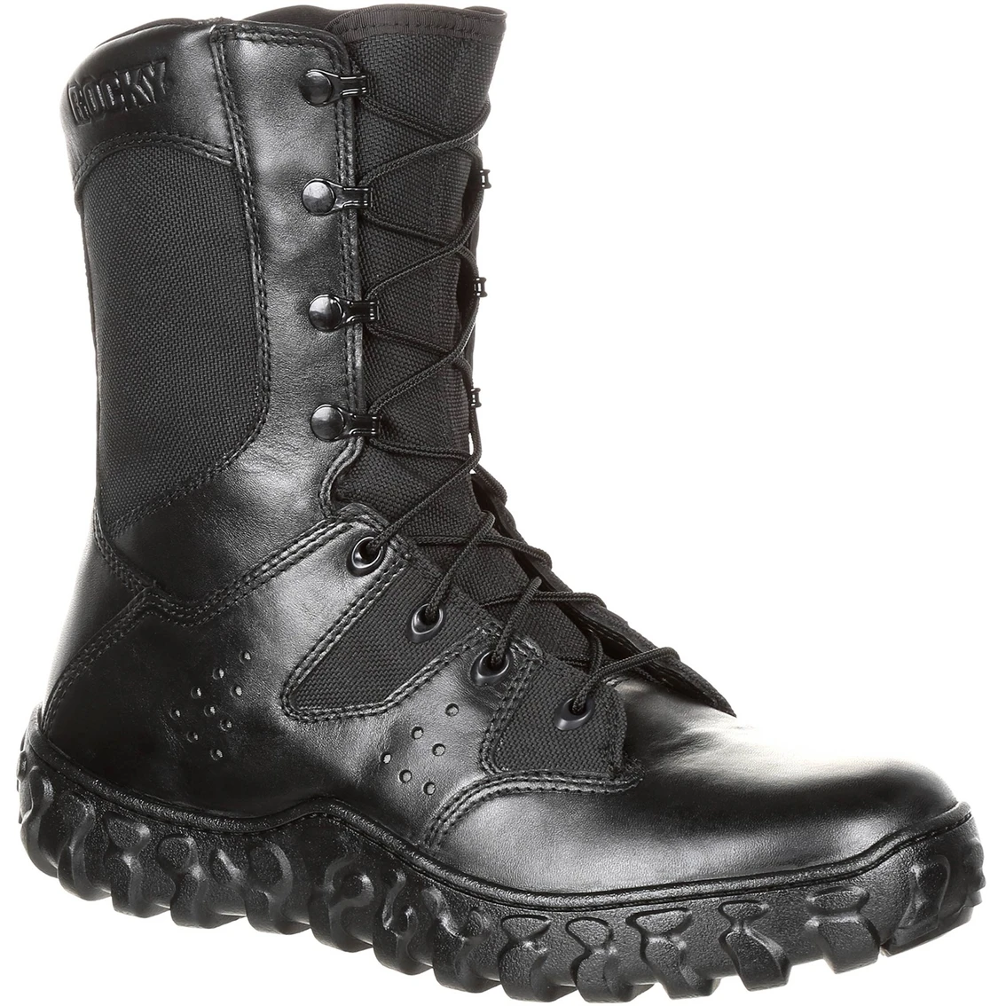 The Rocky S2V Predator Duty Boot is a high-quality black full-grain leather duty boot that wears comfortable even in the toughest of conditions. Made of flash-resistant, water-resistant leather and 1,000-denier CORDURA nylon, this boot is PTFE-coated for flame resistance. Drainage vents with advanced S2V Sieve technology circulate air in and push water out, allowing you to quickly “walk-them-dry.” The durable, triple-stitched boot stays together through wear and tear, and reduces ankle injuries with Roll-Stop Ankle Stability. The stretch LYCRA tongue hugs your foot for a secure fit. This tactical boot has a Vibram sole with proprietary high walls and a polyurethane midsole. Inside the footwear are features that make this a comfortable boot. The Dri-Lex lining wicks away moisture. The Rocky Air-Port footbed cushions your foot and has perforations for air flow. An Aegis microbe shield on the footbed helps fight odor and bacteria. The fiberglass shank supports the arch of your foot. If you’re looking for a black duty boot that exceeds your comfort and performance needs, get the Rocky S2V Predator Duty Boot. Style: RKC075.